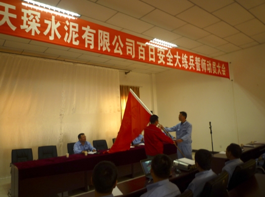 動員大會上劉總向安全生產(chǎn)部授予百日安全大練兵儀式旗。